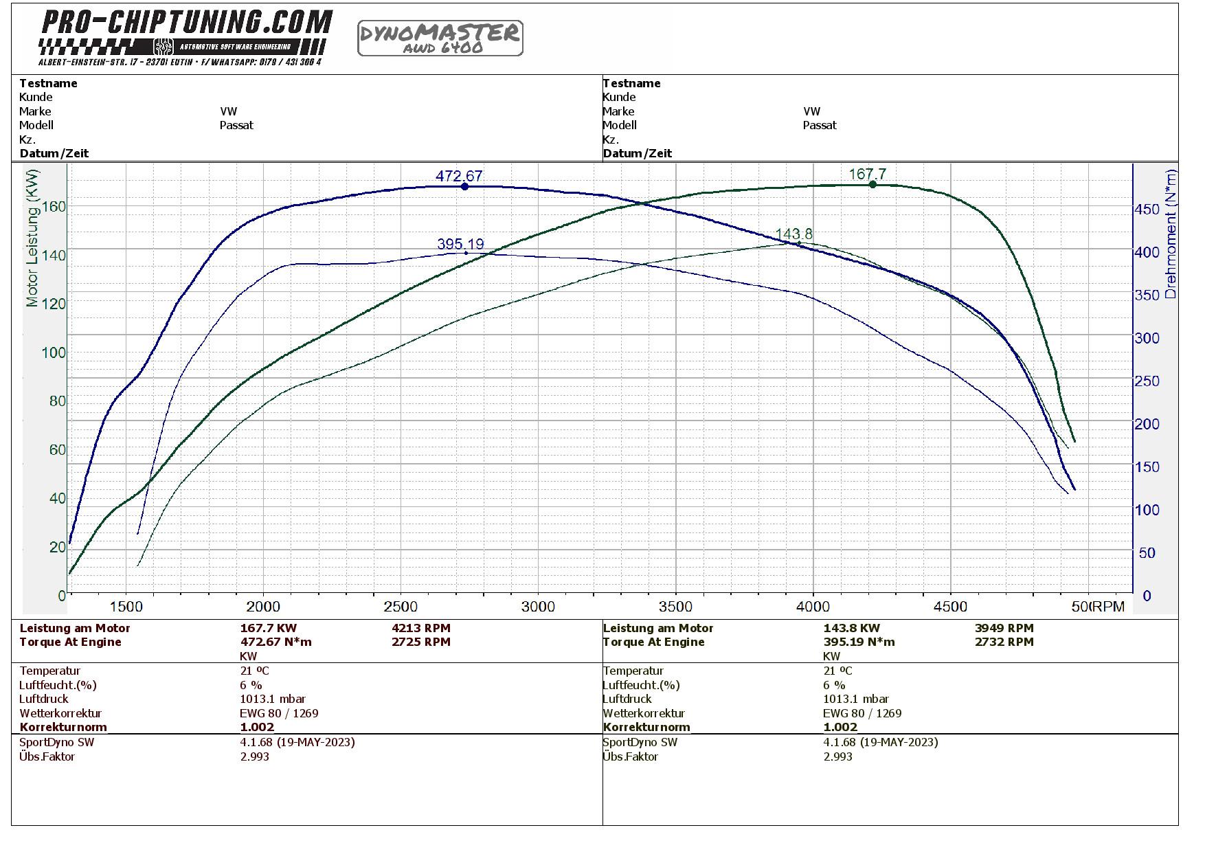 Leistungssteigerung für diesen VW Passat B8 - 2.0 TDI (Baujahr 2015). Der DDAA - Motor leistet 190 PS (400 NM Drehmoment) im Serienzustand / Werksangabe. Der Wagen hat unsere bewährte Stufe 1 Abstimmung am Prüfstand erhalten. Selbstverständlich inkl. Anpassung des DQ250 DSG-Getriebes!