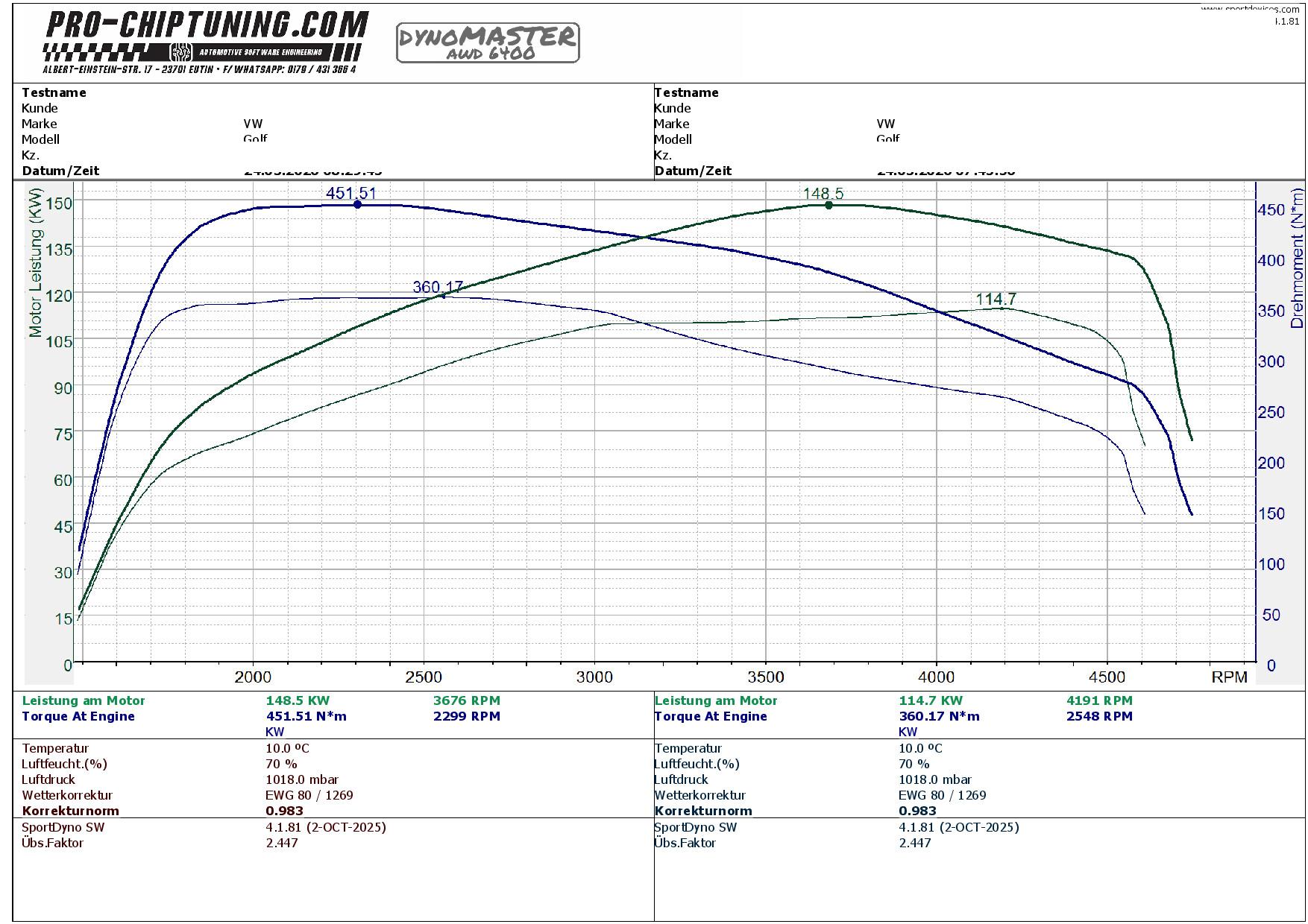 Leistungssteigerung für diesen VOLKSWAGEN, VW Golf 8 - 2,0 TDI (Baujahr 2021). Der DTSB - Motor leistet 150 PS (360 NM Drehmoment) im Serienzustand / Werksangabe. Bei uns am Prüfstand eingestellt gibt es knappe 50PS und 90NM mehr! Steht dem 8er ausgezeichnet!