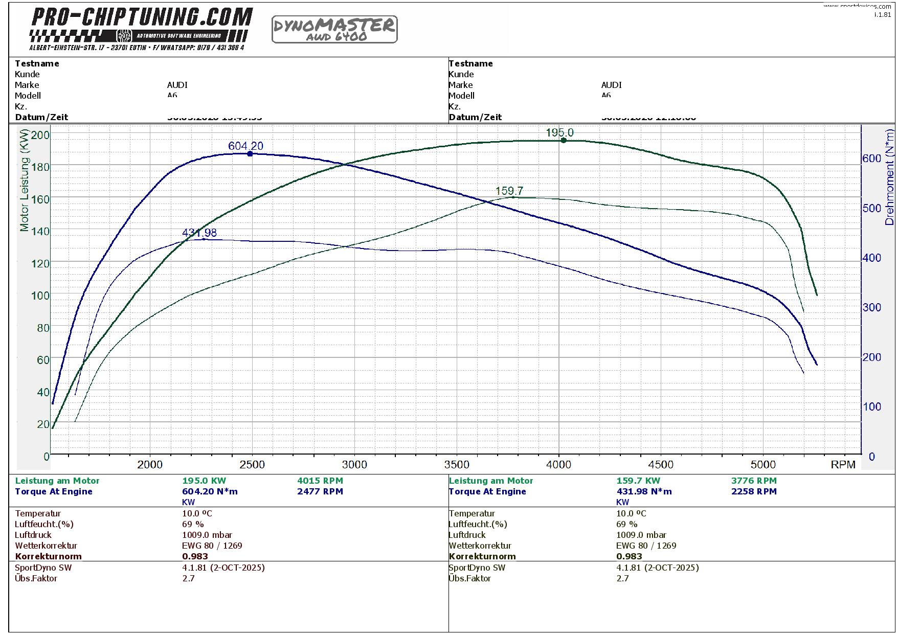 Leistungssteigerung für diesen Audi A6 - 3,0 TDI (Baujahr 2013). Der CLAB - Motor leistet 204 PS (400 NM Drehmoment) im Serienzustand / Werksangabe.