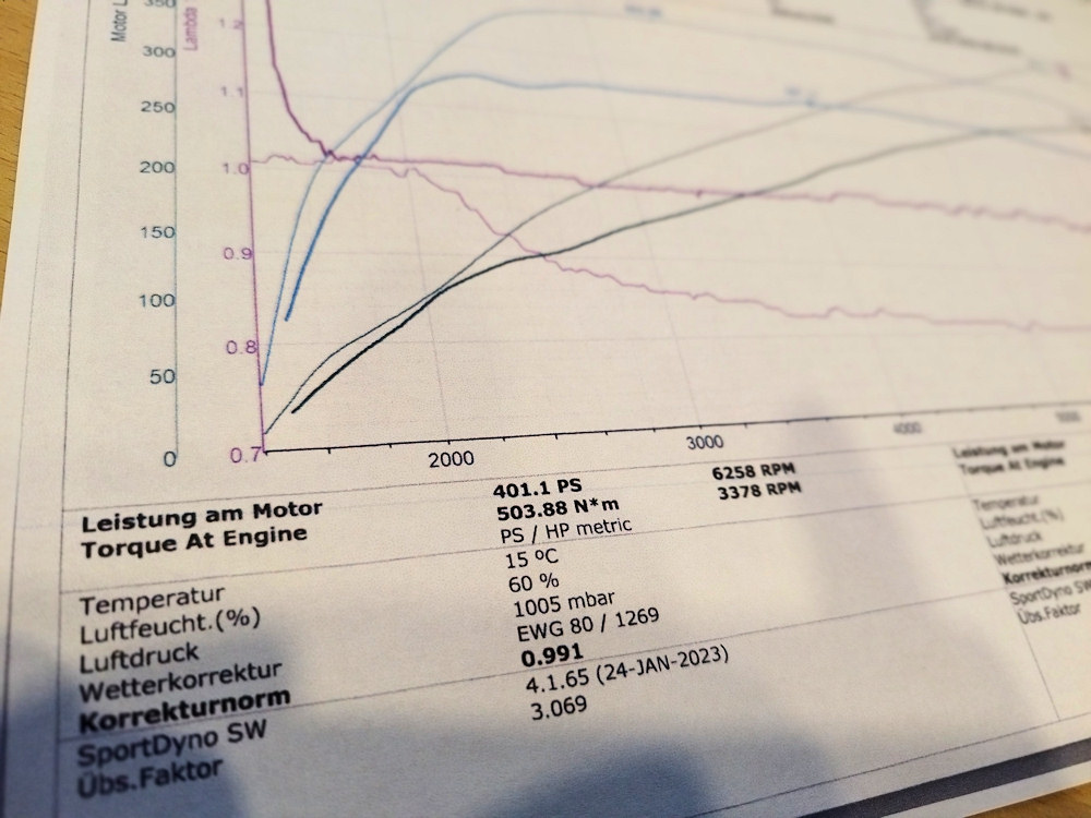 - Abstimmung Motorsoftware (100 Oktan) auf dem Prüfstand (401PS / 504Nm)