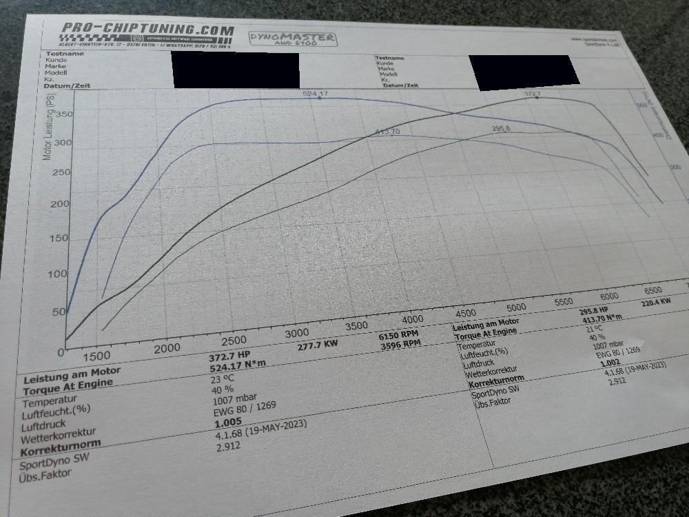 - Abstimmung Motorsoftware (100 Oktan) auf dem Prüfstand (372PS / 524Nm)