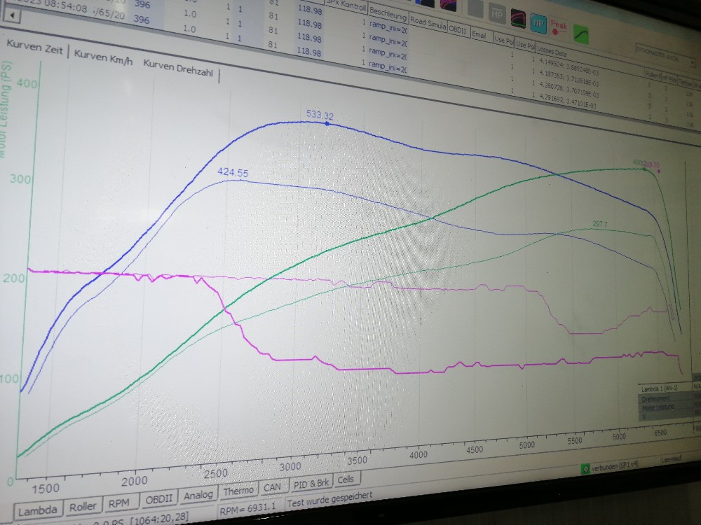 - Abstimmung Motorsoftware (100 Oktan) auf dem Prüfstand (400PS / 533Nm)