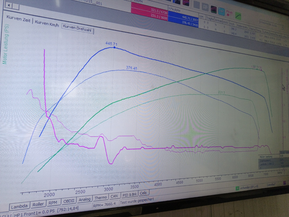 - Abstimmung Motorsoftware auf dem Prüfstand (321PS / 445Nm)