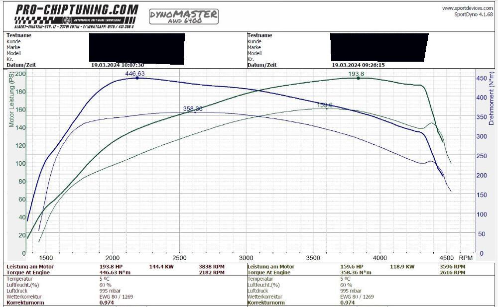- Abstimmung Motorsoftware auf dem Prüfstand (194PS / 446Nm)