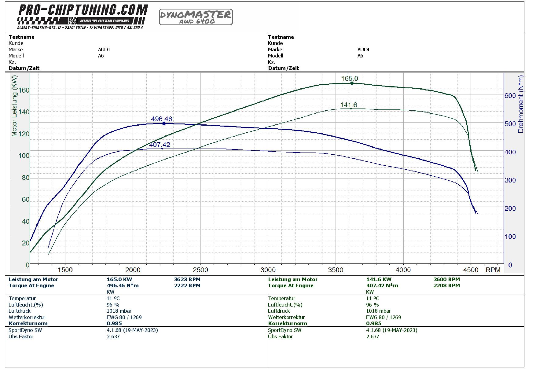 Leistungssteigerung für diesen Audi A6 - 2.0 TDI (Baujahr 2018). Der DDDA - Motor leistet 190 PS (400 NM Drehmoment) im Serienzustand / Werksangabe. Der Kunde vermisste in diesem A6 etwas mehr Durchzug - da können wir natürlich behilflich sein :)
