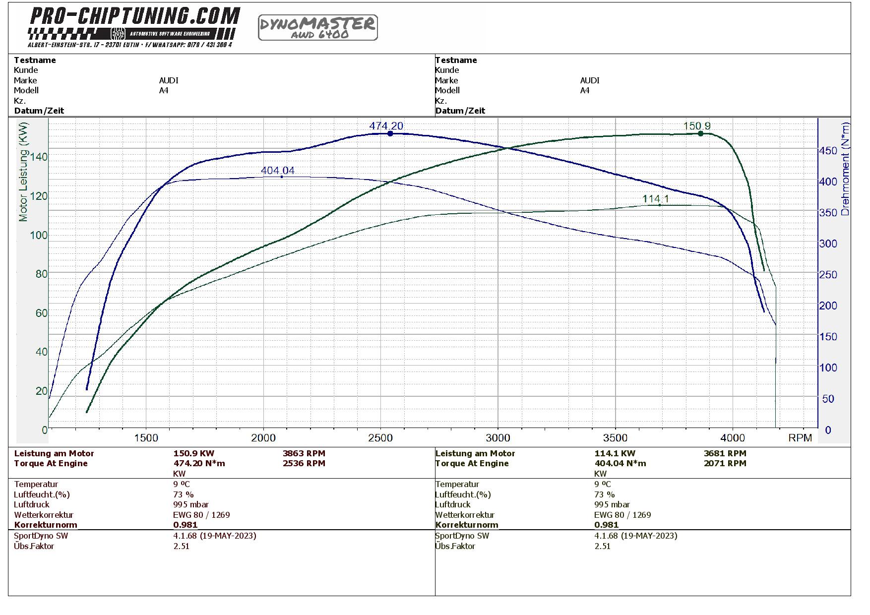 Softwareoptimierung Audi A4 2,0L TDI 35TDI mit 163PS Serienleistung. Satte 50PS drückt der Motor nach unserem Eingriff mehr!