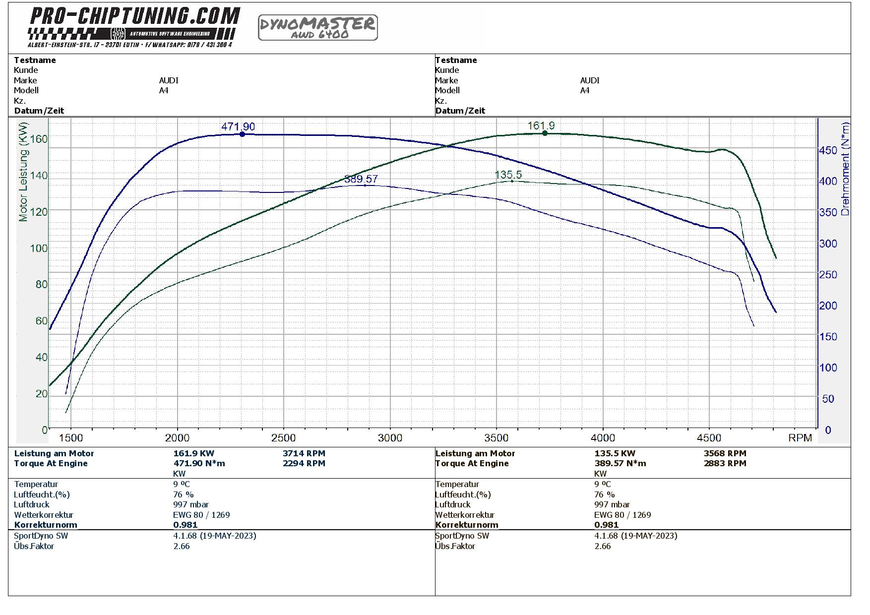 Leistungssteigerung für diesen Audi A4 B8 - 2.0 TDI CR DPF (Baujahr 2015). Der CNHA - Motor leistet 190 PS (400 NM Drehmoment) im Serienzustand