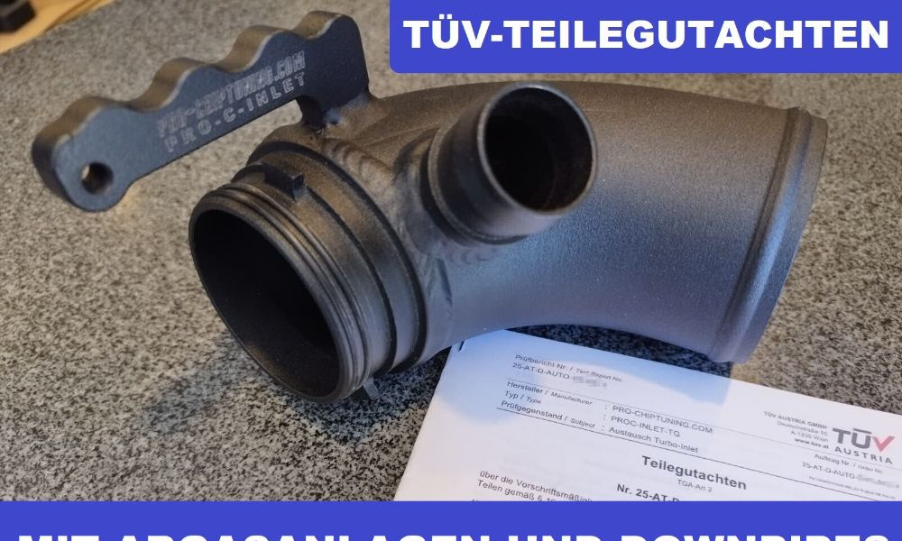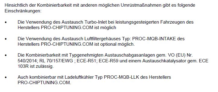 Selbstverständlich liefern wir unsere Turbo-Inlets inkl. TÜV-Teilegutachten aus (§19.3) - Das hat seltenheitswert! Die Mitbewerber liefern i.d.R. nur eine gutachterliche Stellungnahme mit. Unsere Gutachten sind so ausgestaltet, das eine Kombination des Turbo-Inlets mit typgenehmigten Austauschabgasanlagen und Austauschkatalysatoren (Downpipes) möglich ist und diese so spielend einfach in Kombination eingetragen werden können. Weiterhin ist eine Kombination mit unserer offenen Ansaugung (PROC-MQB-INTAKE), Ladeluftkühler (PROC-MQB-LLK) und unserer Leistungssteigerung möglich!