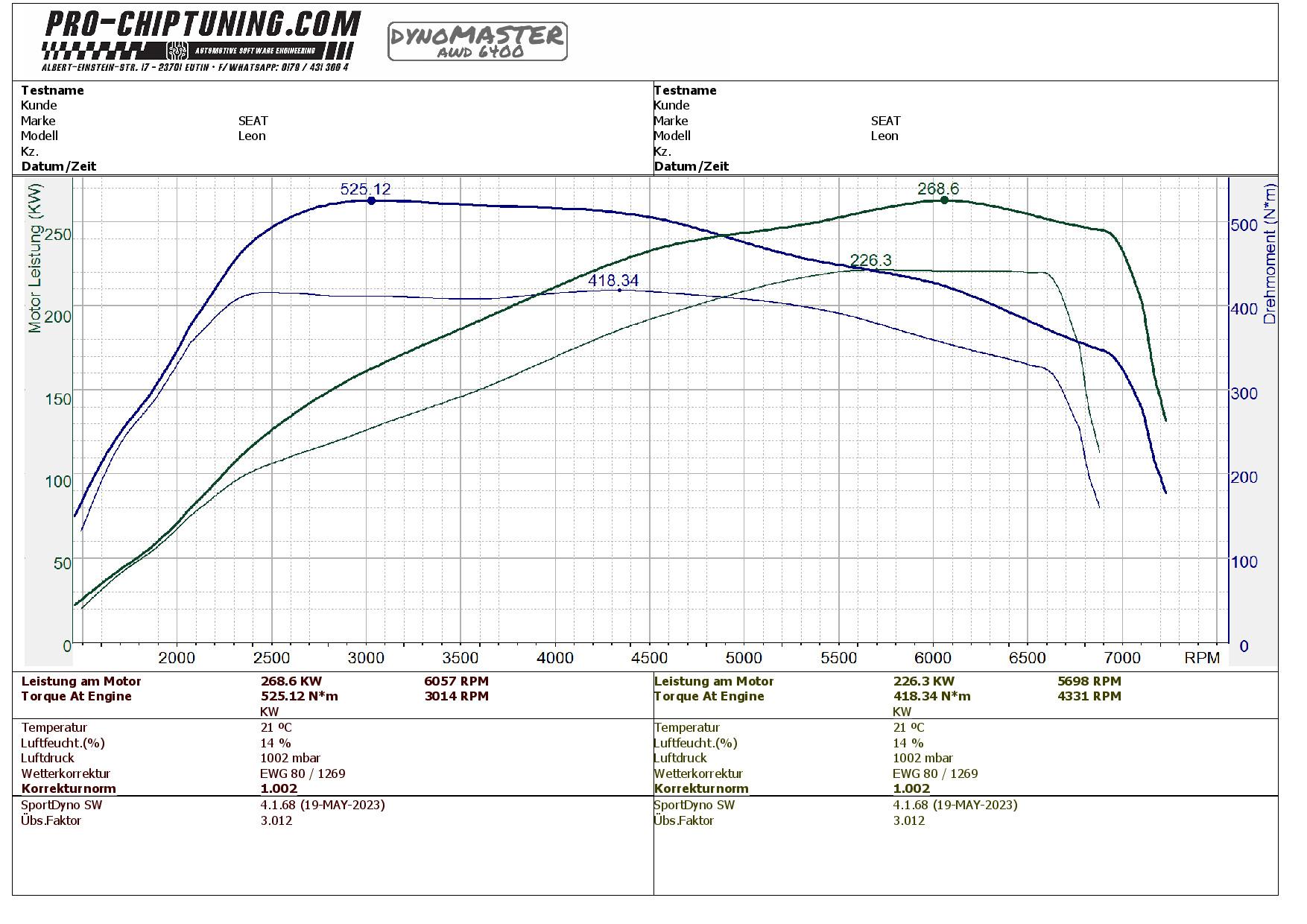 Leistungssteigerung für diesen Seat Leon - (Baujahr 2019). Der DNU - Motor leistet 300 PS ( 400 NM Drehmoment) im Serienzustand / Werksangabe.