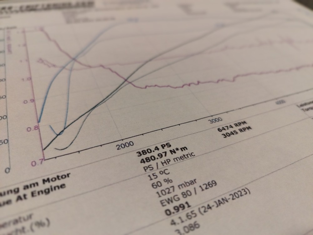 - Abstimmung Motorsoftware (100 Oktan) auf dem Prüfstand (380PS / 480Nm)