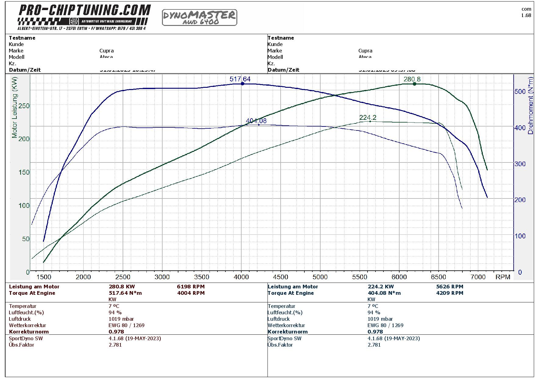 Leistungssteigerung für diesen Cupra Ateca - 2.0 TSI (Baujahr 2020). Der DNU - Motor leistet 300 PS (400 NM Drehmoment) im Serienzustand / Werksangabe. Verbaut war bei diesem Fahrzeug außerdem eine FOX-Abgasanlage und ein BARTEK Ladeluftkühler (ohne Gutachten).